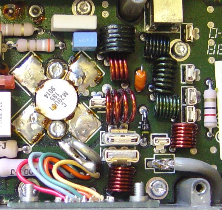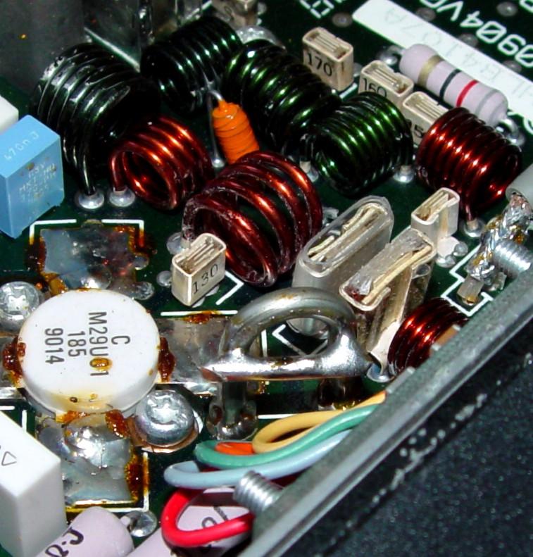 And here's the original power amplifier (PA). The cover was removed for this photo. Notice the silver-coated hairpin coil (between the green and orange wires at the top of the photo) and how tight the enameled wire coils are: