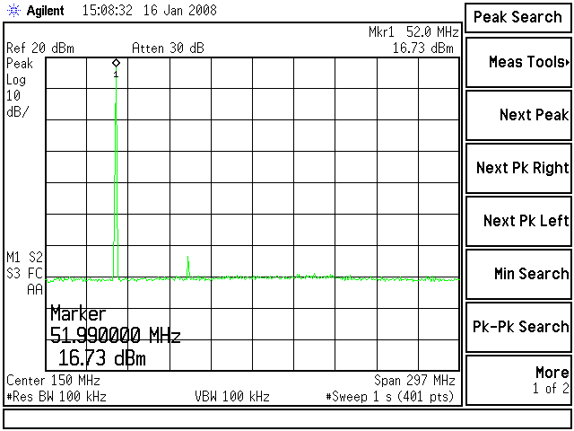 Just to make sure the transmitter isn't throwing out all sorts of spurs and harmonics, I measured the output with a spectrum analyzer, paying particular attention to the range of 1 MHz to 200 MHz. On 42 MHz I found two good-sized spurs a few MHz away from the carrier, but on all other transmitter frequencies the 2nd harmonic was the only visible spur, and that was down about 60dB; the spec is -61dB. There were no other harmonics visible. Here's the spectrum analyzer output of the modified radio making 45 watts at 52 MHz, when fed through a 30dB coaxial attenuator: