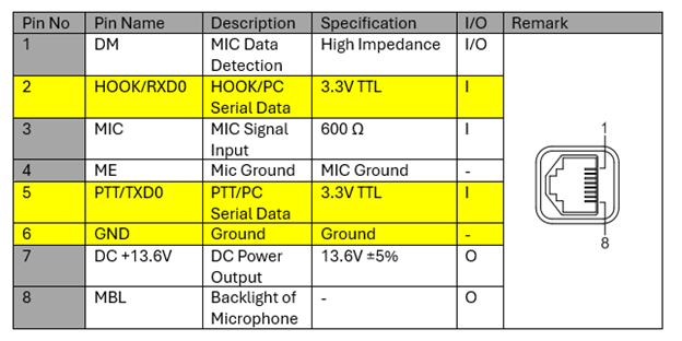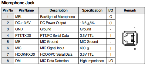 My first stop was the user manual for the Maxon TM-8000 series radios used by Bridgecom. Maxon was kind enough to publish the microphone jack pinout on the TM-8000 radios.